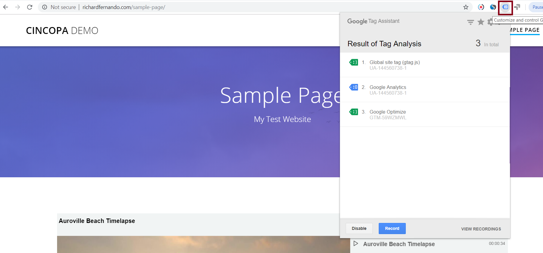 Once the extension is installed, access the web page on which the Cincopa Gallery is embedded. Then, click on the Tag Assistant icon in the top to see if Google Optimize is been added properly.