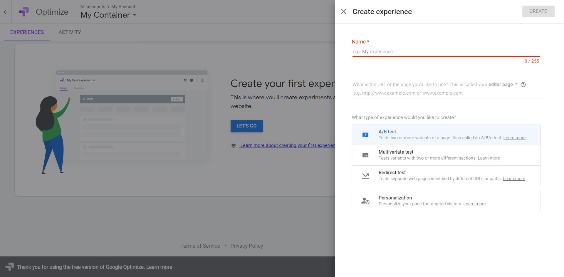 Enter a name for the experience >> Enter the URL of the web page you would like to use >> select the type of Testing (In this case A/B testing) then click on CREATE.