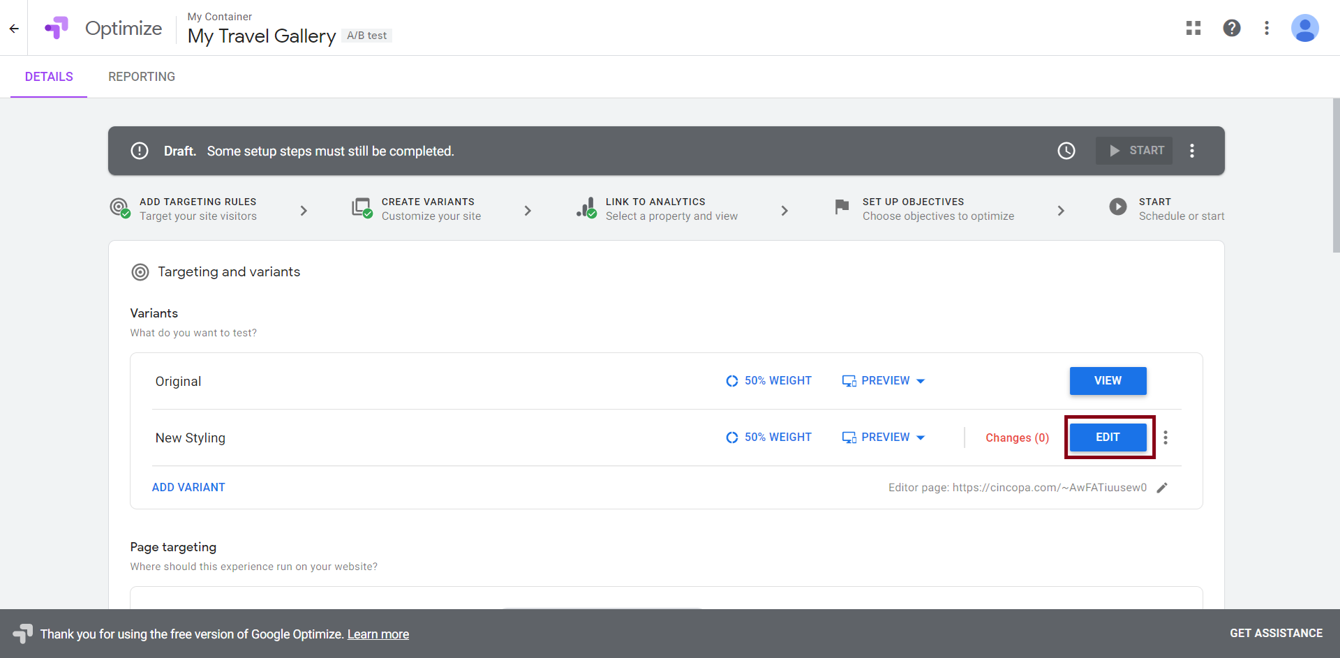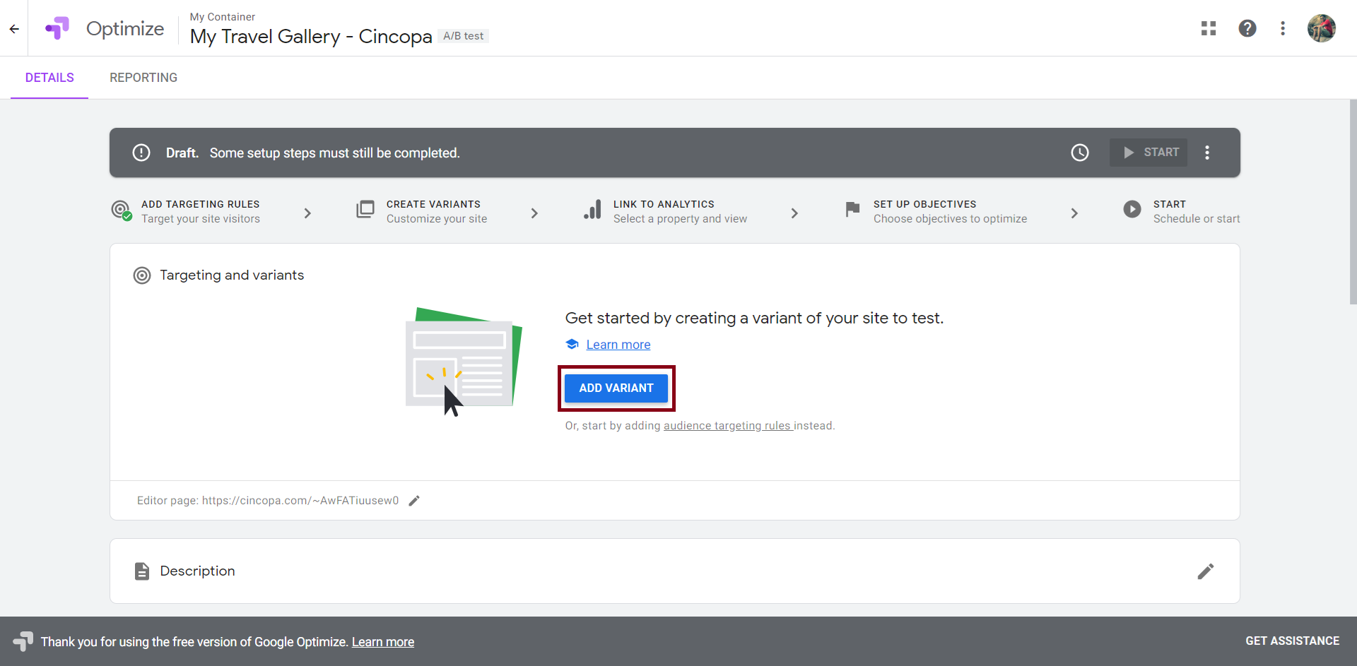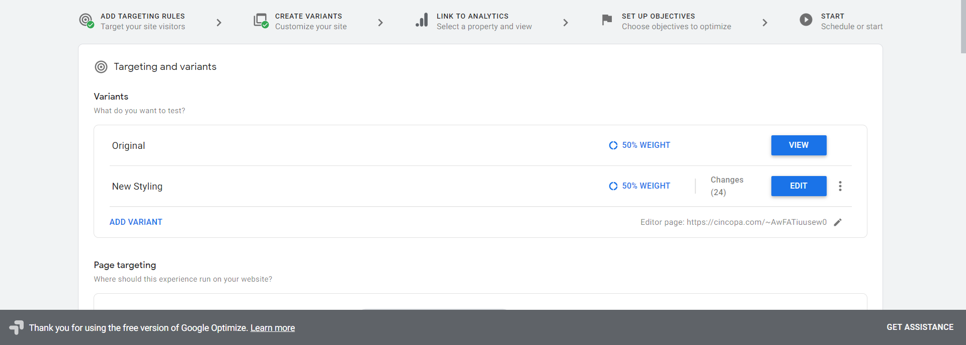 Now, click on Add Variant to create a new variation of the web page you entered.