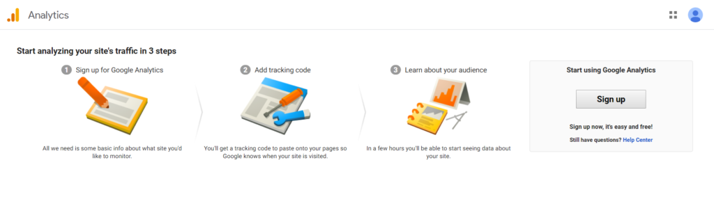 Access the website URL : https://analytics.google.com and then click on Sign Up.