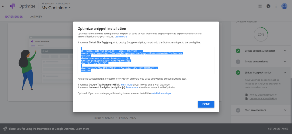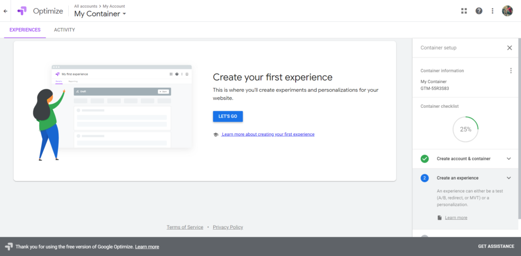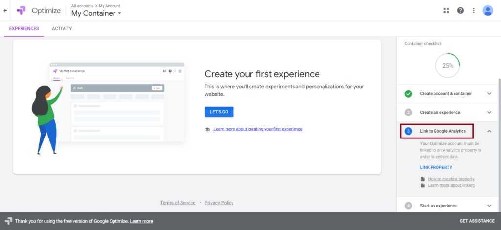 Once the Google Analytics account is created, we can then move on to Google Optimize.