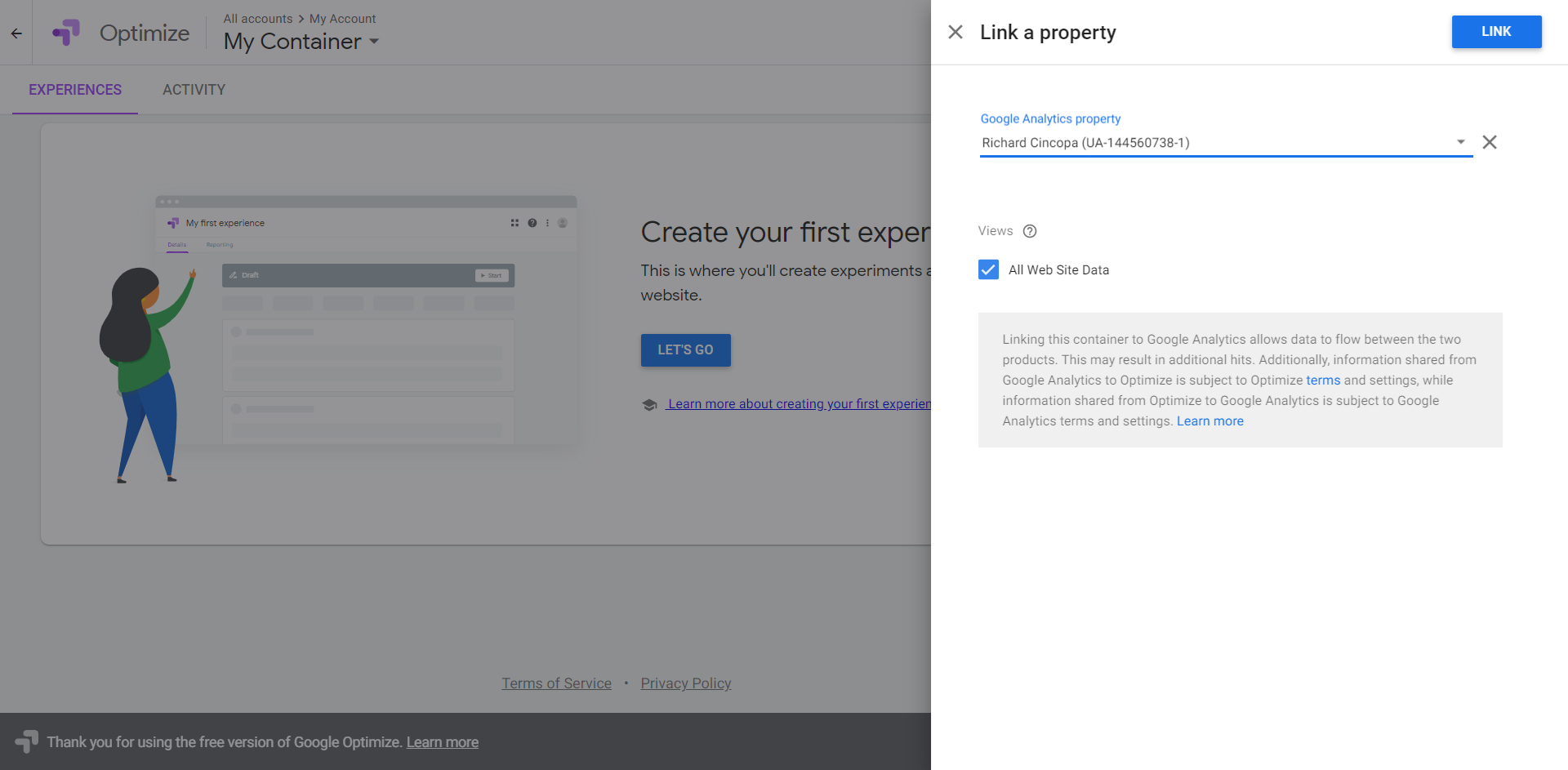 You can then click on Link to Google Analytics so we can connect your Google Optimze account with your Google Analytics Account.