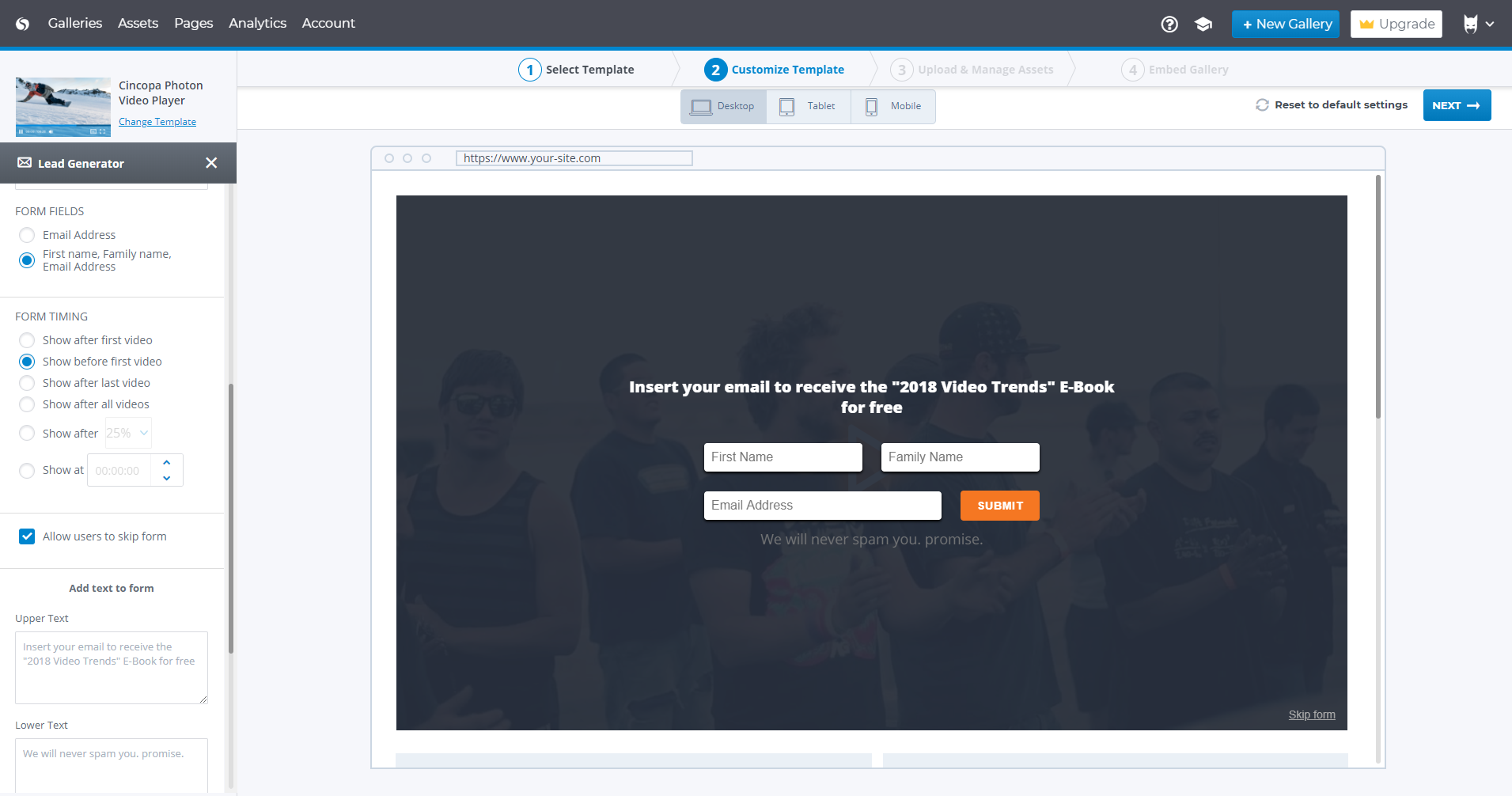 IMPORTANT NOTE: In Cincopa, Most of the Video Interactive Features (Lead Gen for example) exist on a gallery level. Therefore, for your purpose, we recommend using and embedding a Video gallery rather than an asset, Even for a single video.