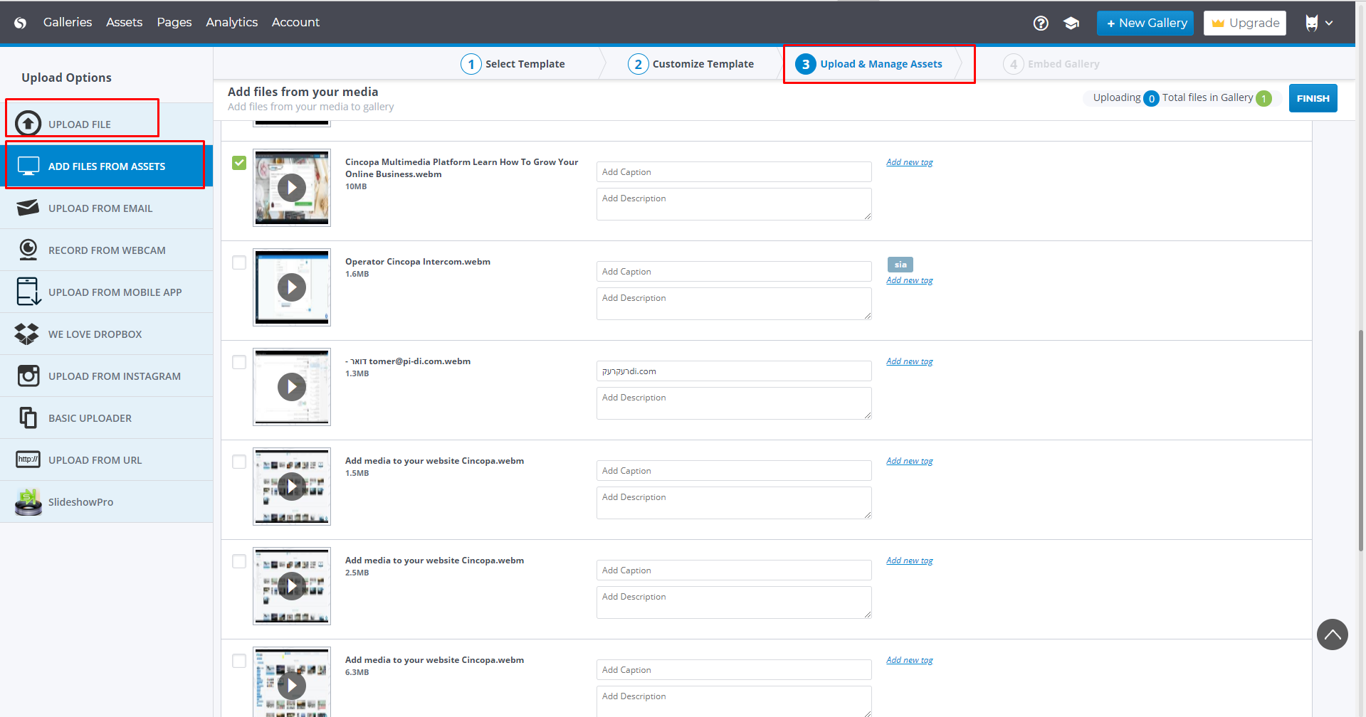 Use the “select Files from Assets” Tab to pick a video from your existing video assets that you uploaded earlier or upload new assets. These will also be added to this specific gallery and will be available on your account for later us to be included in other galleries.