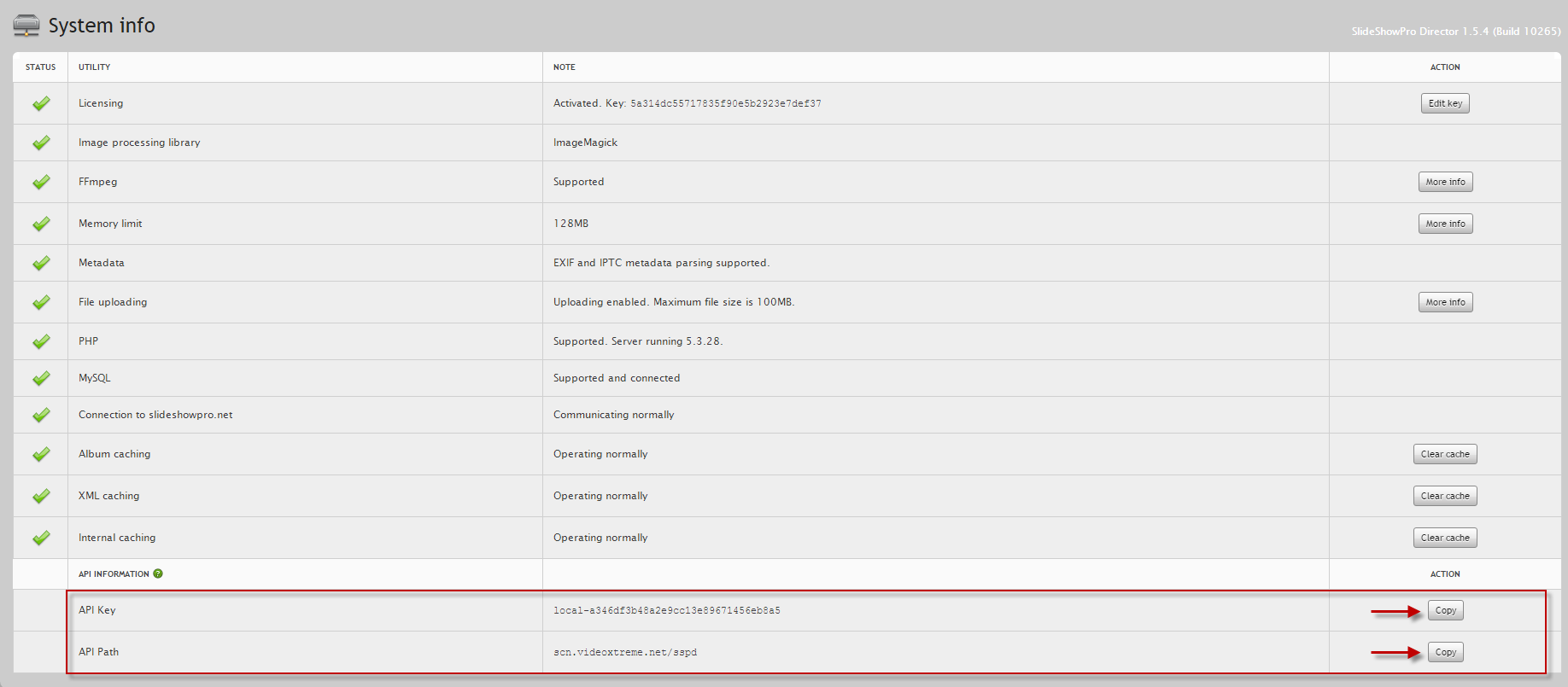 - Locate and copy both the API Key and API Path from the System Info page