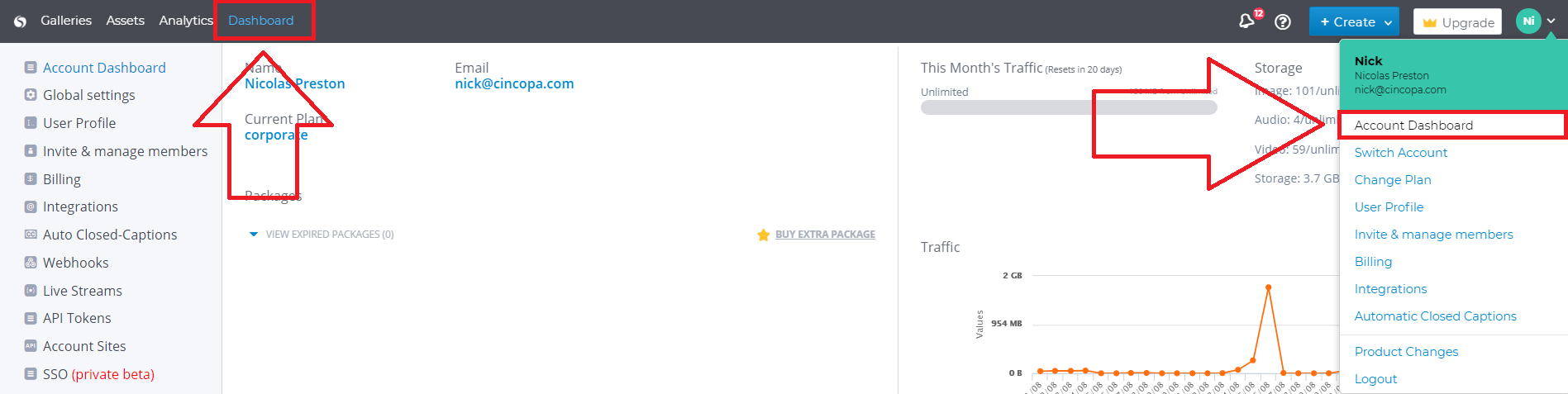 You can see how much storage and traffic you have used by logging in to your Cincopa account and visiting the Account Dashboard.