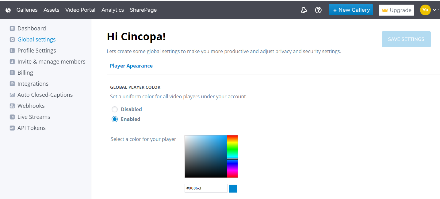 Selecting a color will set a uniform color for all video players under your account. You can modify the colors on the SharePage to match your branding. Viewers who are comfortable with your brand colors will be presented with familiar imagery on the page, which can help them feel at home. To use this feature, simply enable the ‘Global Player Color’ and then choose a color that best suits your needs.