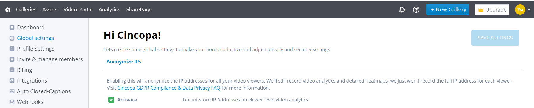 Enabling this will only partially record the IP addresses for all your video viewers. Cincopa will still record video analytics and detailed heat maps but we won’t record the full IP addresses for each viewer. This means you will not be able to view the IP address of the viewer.