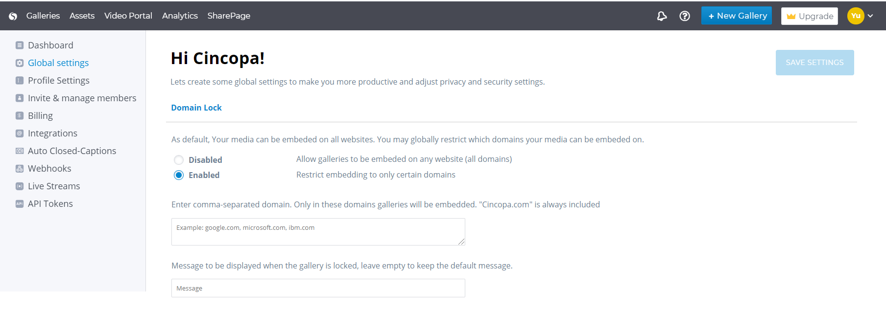 To Enable this, simply move the selector to the enabled position and then enter the domain name. You can customize the message to be displayed when the gallery is locked, or use a default message.