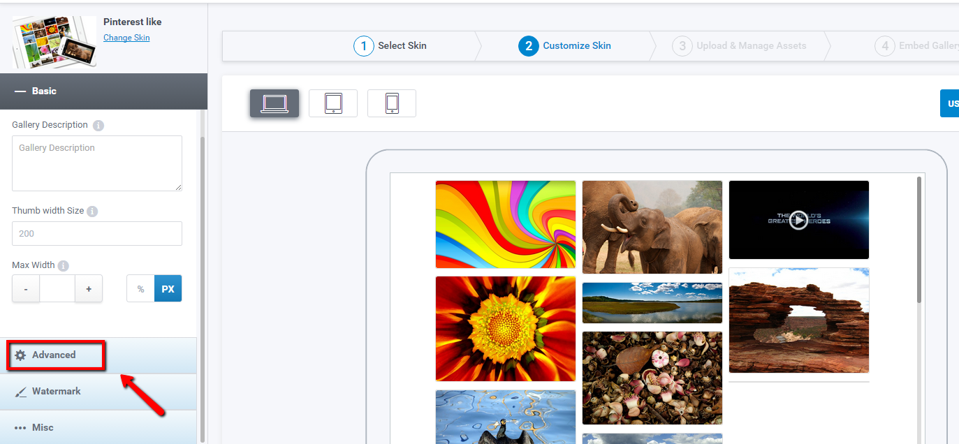 2. On step 2 Customize Skin, click on “Advanced” tab of the image gallery template.