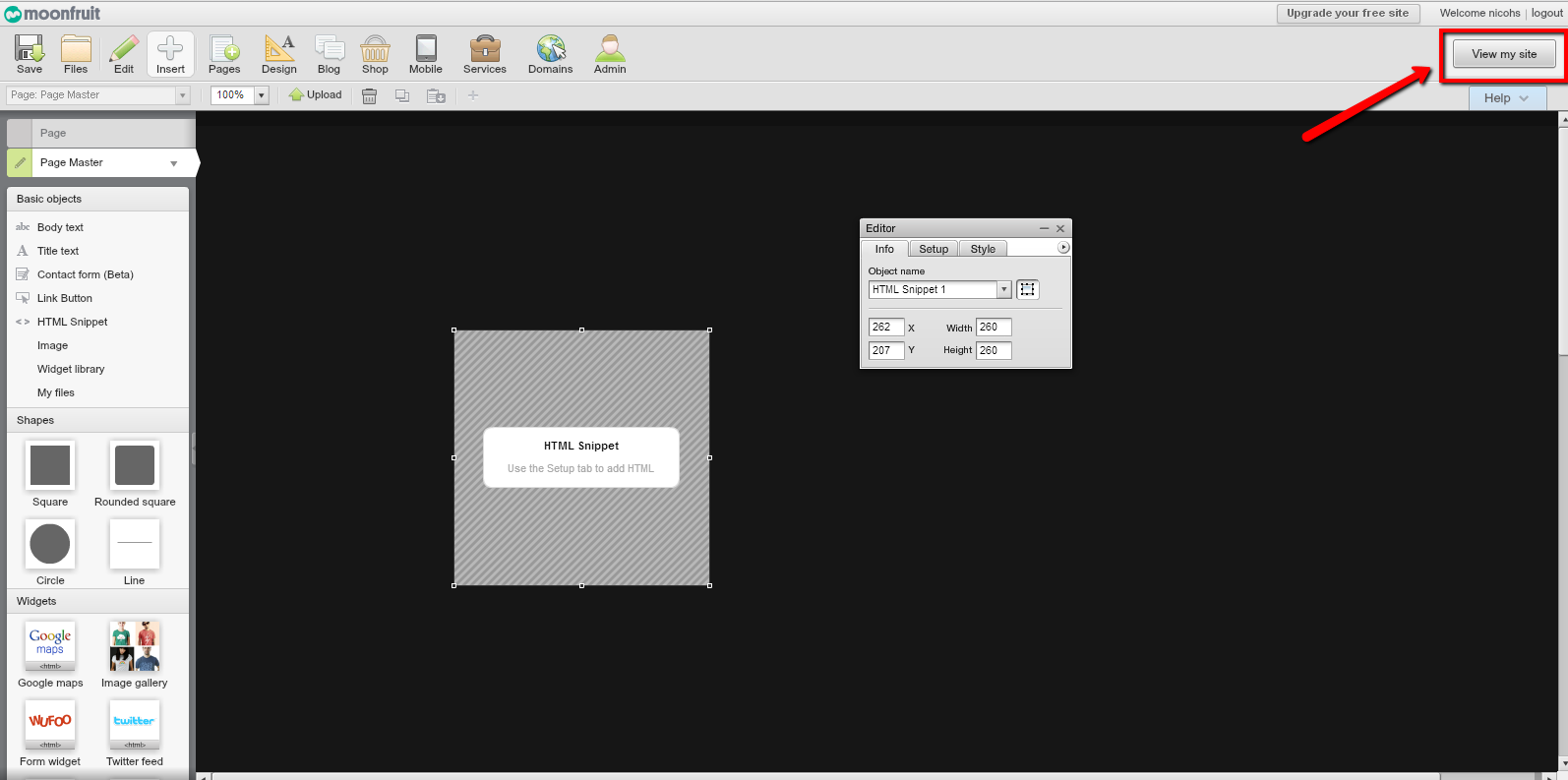 NOTE: On Editor, Info tab you can change width and height of HTML Snippet element or just drag to resize it as needed.