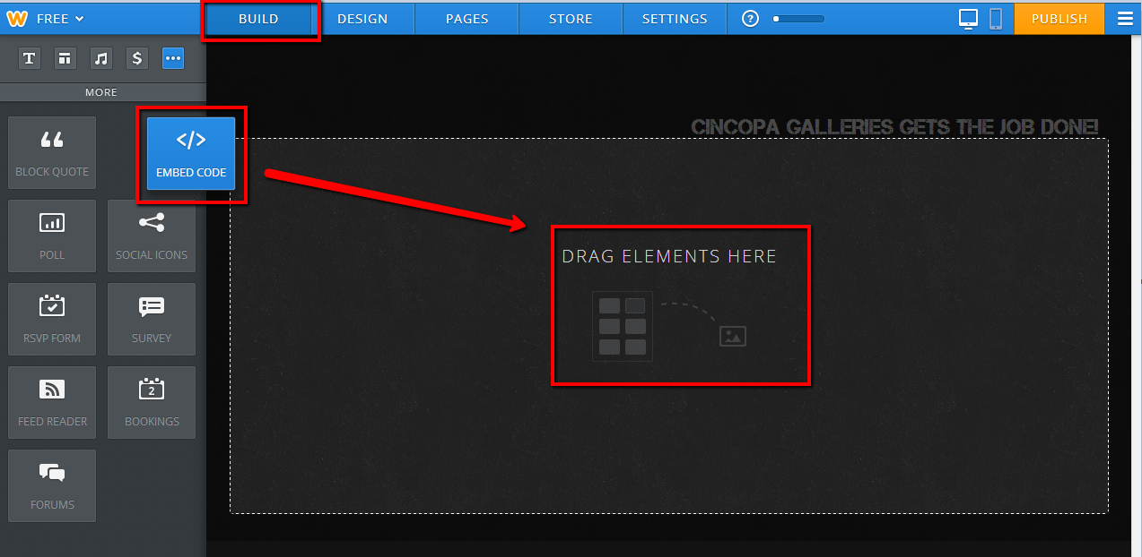 4. Click “Build” and choose “Embed code</>” element to drag and drop where is indicated.
