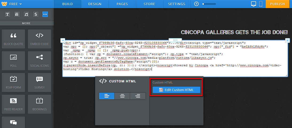 5. Click inside the Embed Code element or click on “Edit Custom HTML” to paste the Cincopa gallery code.