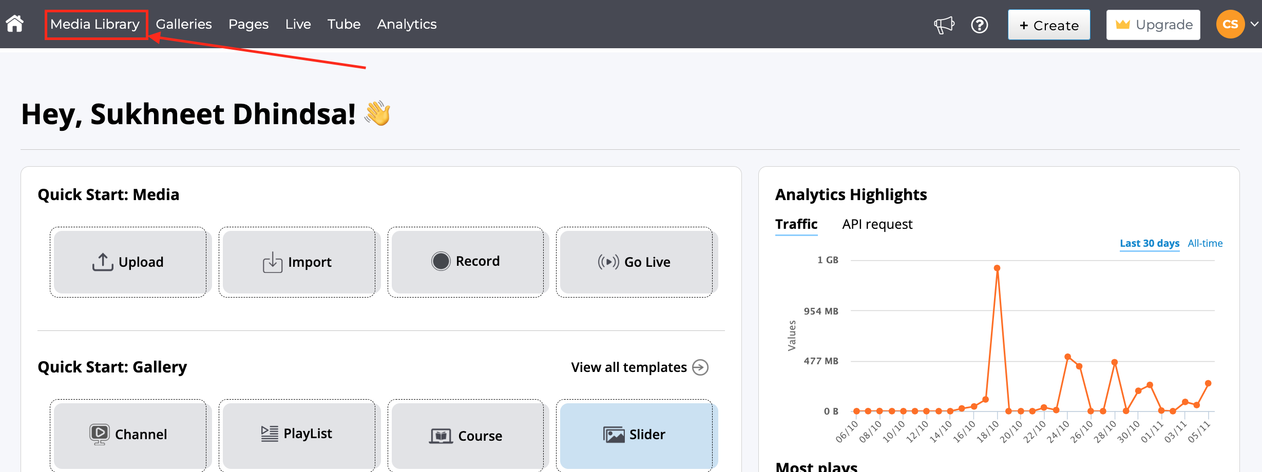 - From the top-left menu, click on Media Library. Here, you’ll see all your media assets—videos, images, audio files, and other non-media files. By default, items are displayed in List (Row) view.