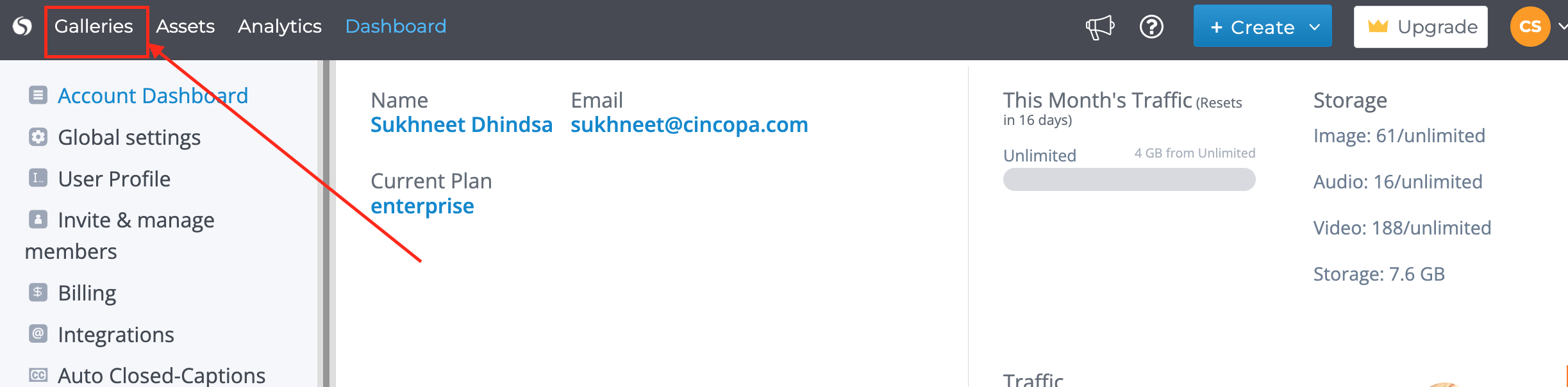 Step 1 : Begin by logging into your Cincopa Account and click galleries in the top left.