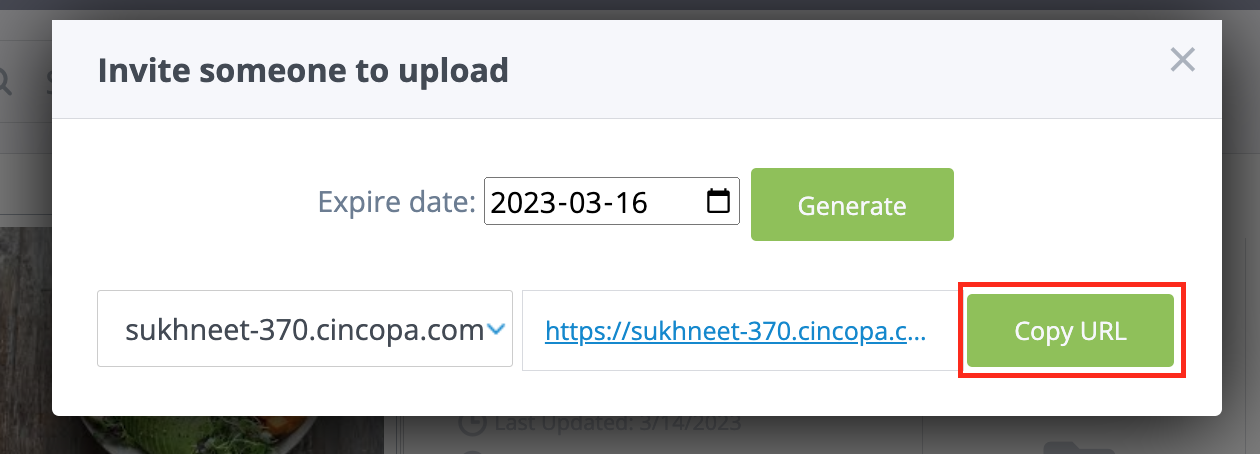 Step 5 : You can now share the link with family, friends, colleagues or clients by clicking on the Copy URL button and they will be able to upload assets to your gallery.