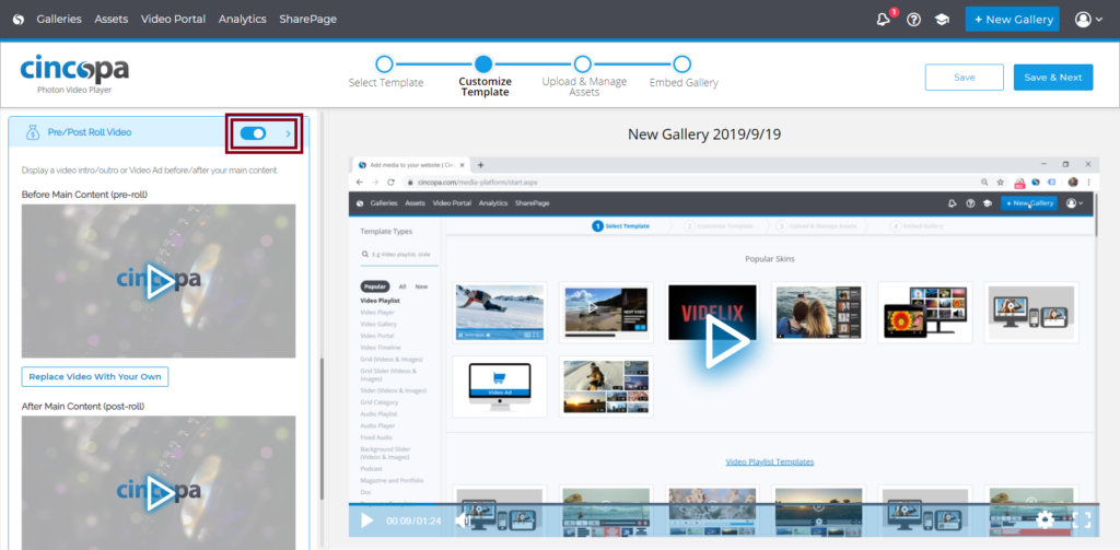 Click on Galleries and click on Customize Galleries icon in the gallery where you wish to add Pre/Post Roll Video