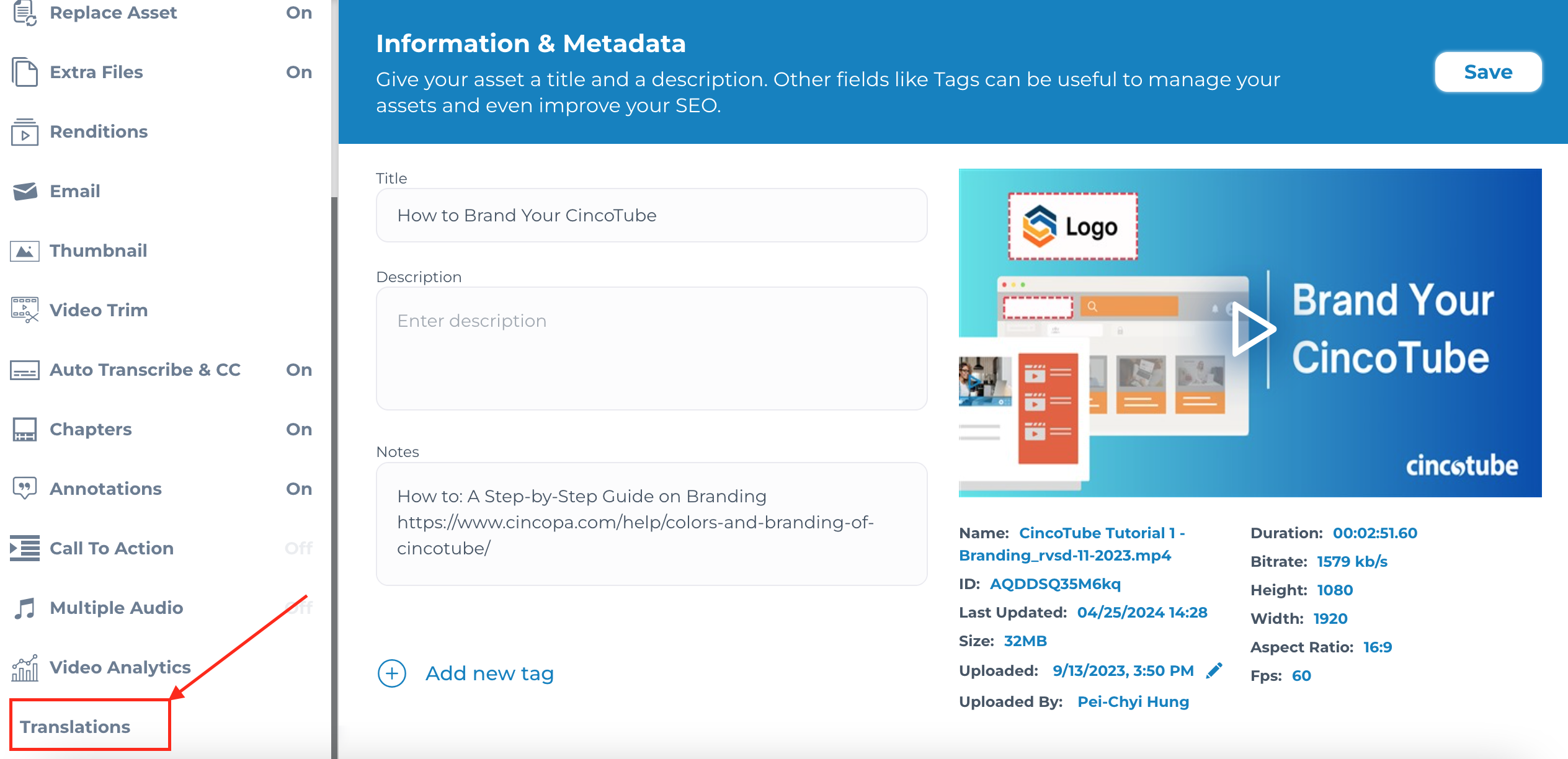 - Choose an asset to which you want to make titles and descriptions available in other languages.