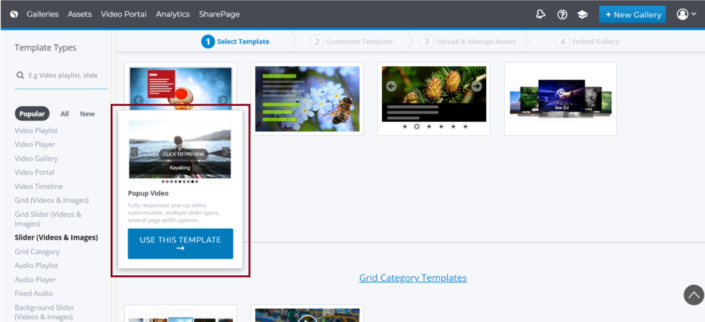 Now, in the Select Template option, you can choose the template with the name – Popup Video to make sure the video should load in a popup and then click on USE THIS TEMPLATE.