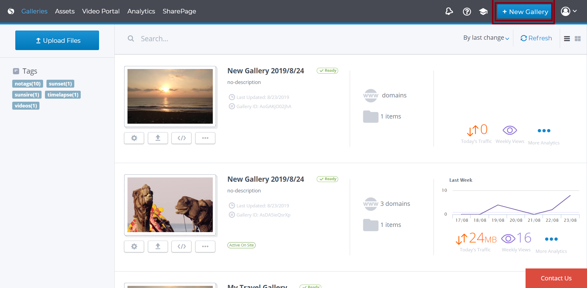 Next, click on Galleries to view your existing Gallery, or create a new one by clicking on + New Gallery.