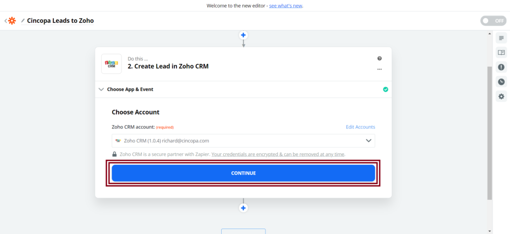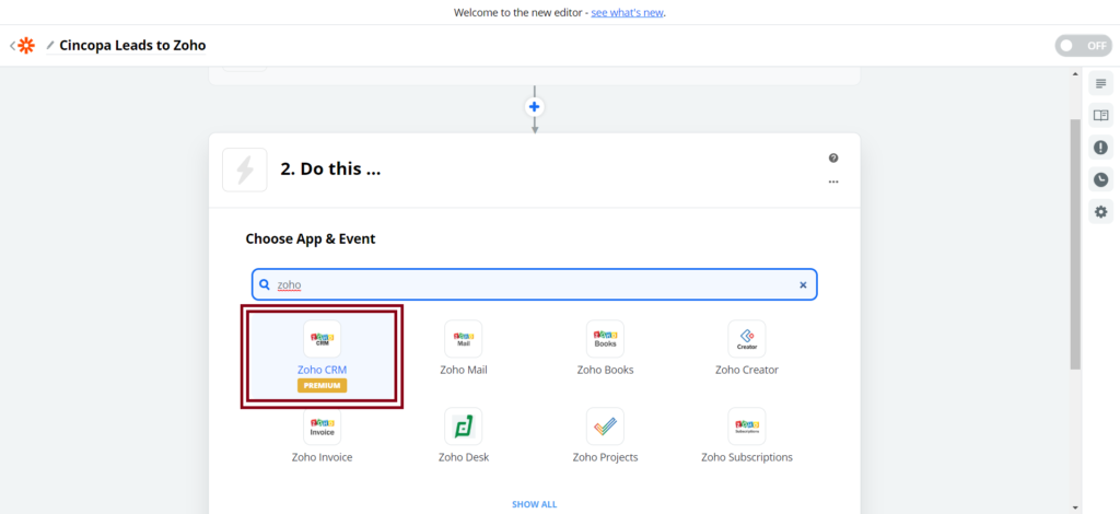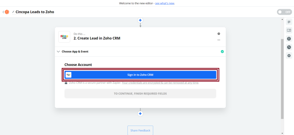 - Choose an action for Zoho CRM when a new lead arrives through Cincopa. Select the Create Lead option.