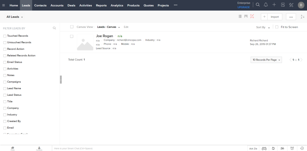 - Now you can log in to your Zoho CRM account to check if you received the test lead we created.