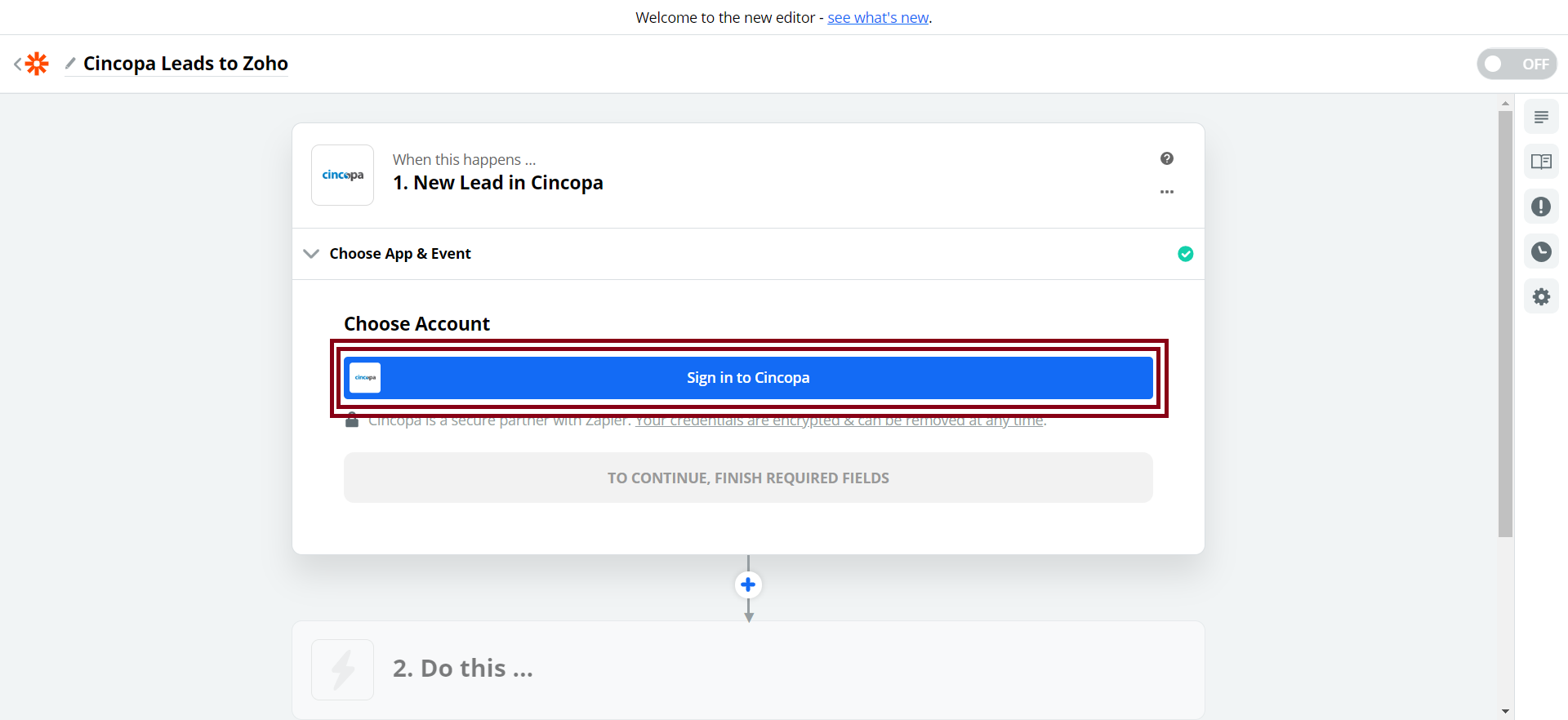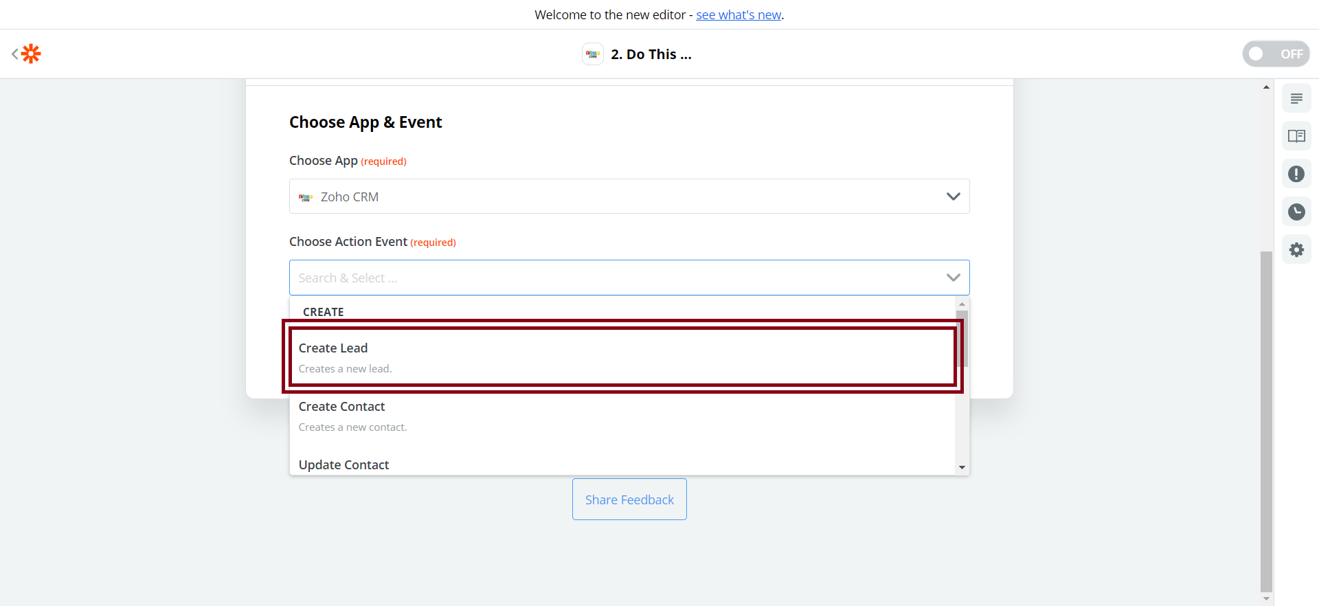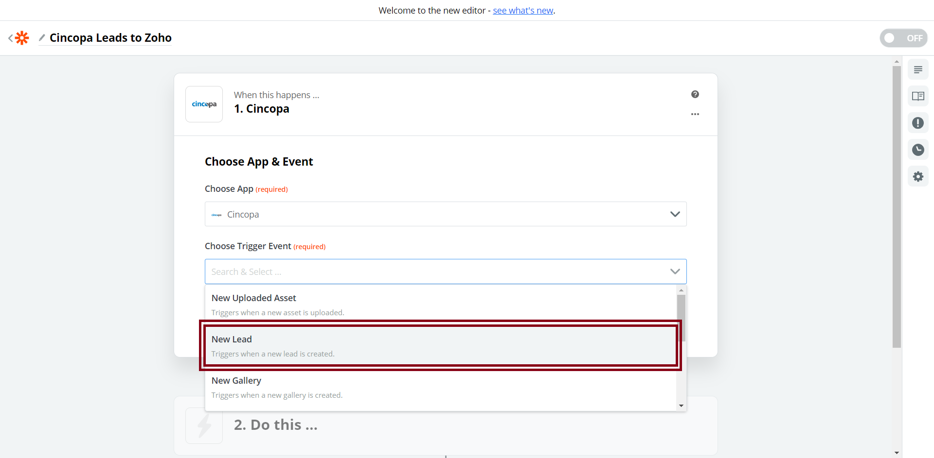 - Choose an action for Zoho CRM when a new lead arrives through Cincopa. Select the Create Lead option.