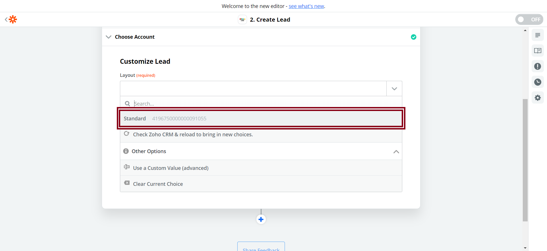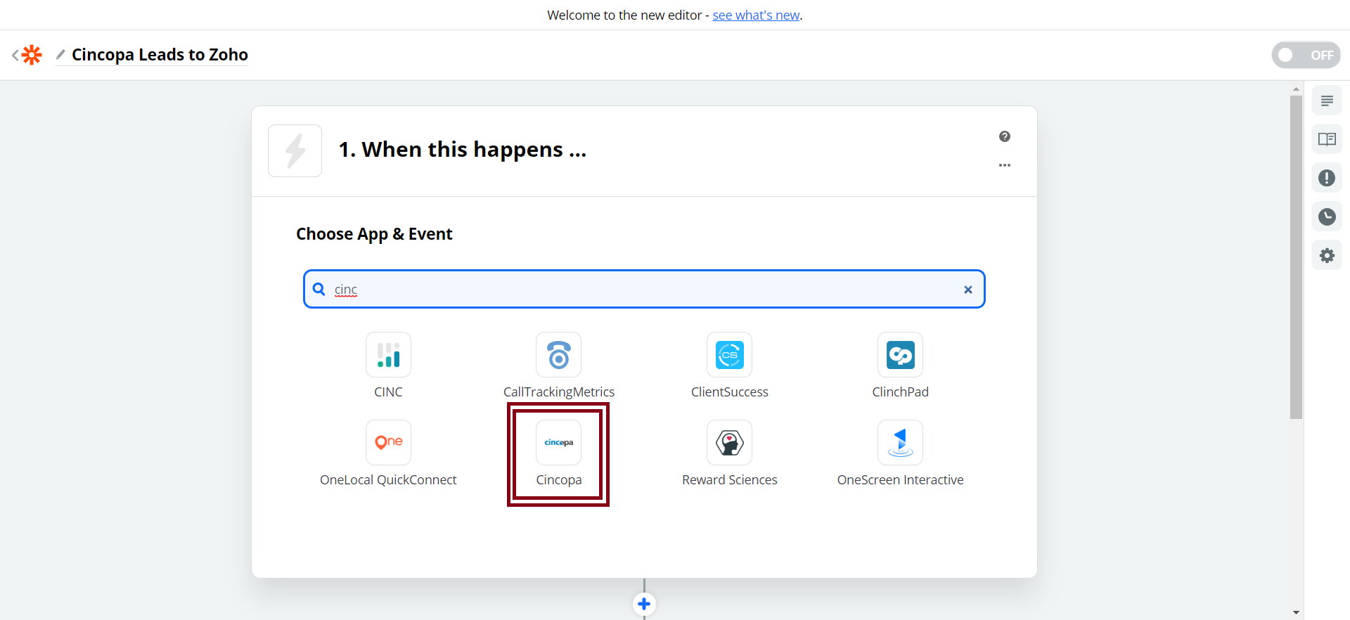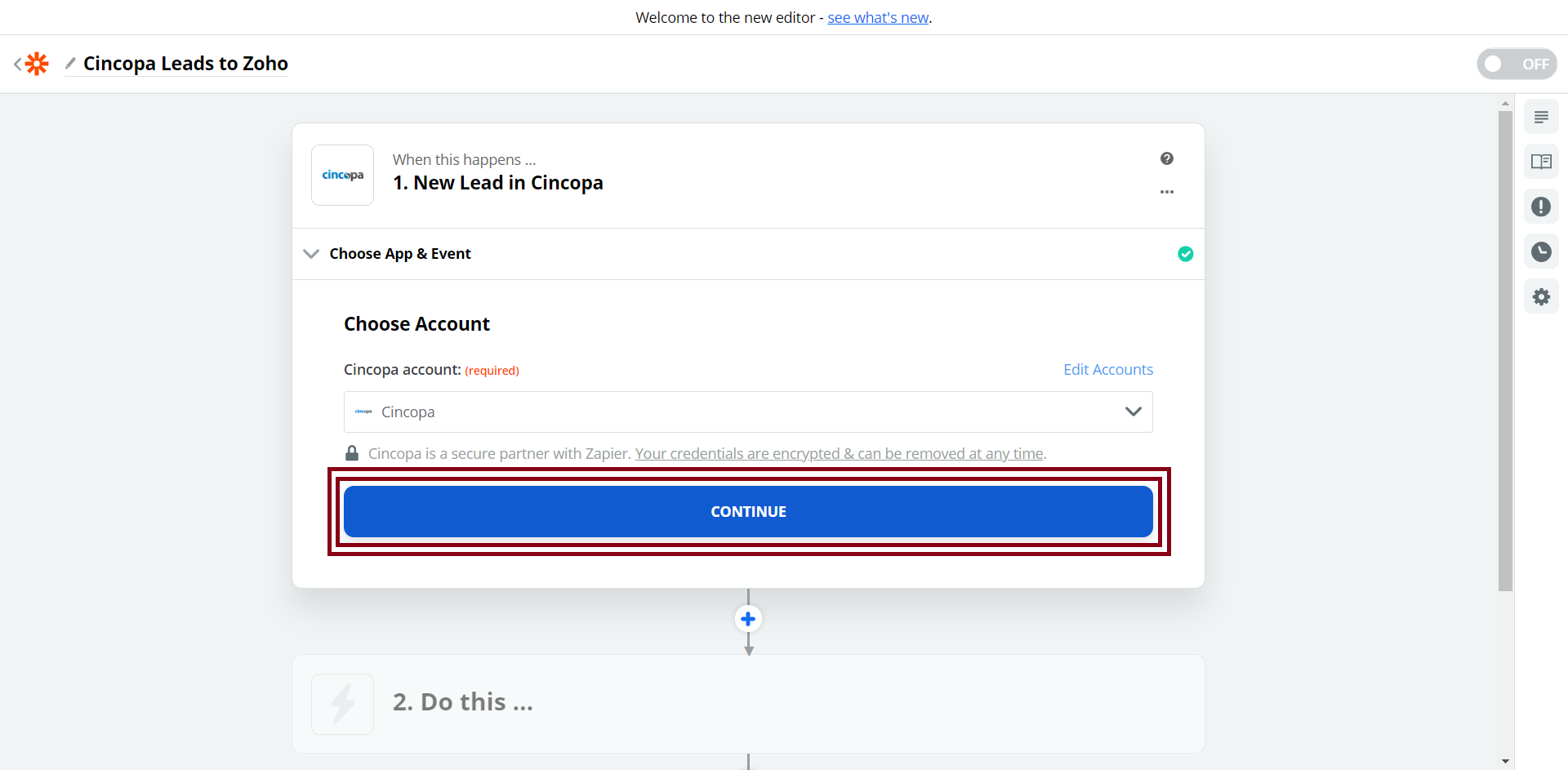 - Choose an action for Zoho CRM when a new lead arrives through Cincopa. Select the Create Lead option.