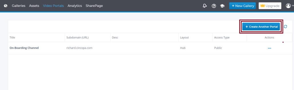 Once you have the ability to add additional portals you will want to navigate to the ‘Video Portal’ area of your Cincopa account (highlighted in the screenshot below). Once there you will want to select the ‘+ Create Another Portal’ option in the upper right-hand corner of your page. Each one of your Video portals will appear in list form on this page and can be accessed from here if you need to edit or make changes to the way they are set up.