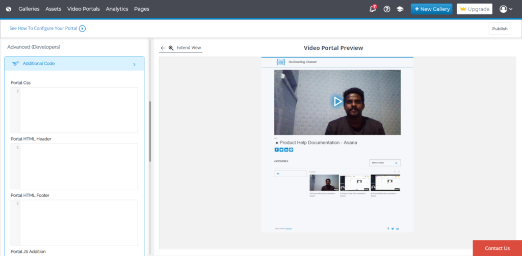 The Video Portals section allows users to add a custom footer where they can use their HTML, CSS, JavaScript code, and create any kind of footer.