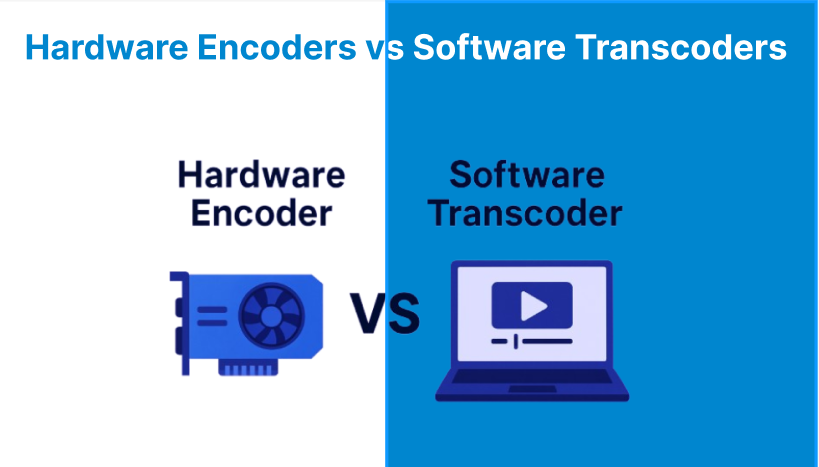 Choosing between hardware encoders and software transcoders directly affects streaming latency, video quality, and infrastructure cost. This guide explains their architectures, use cases, performance characteristics, and decision factors to help select the best solution for media workflows. Architecture & Processing Models Hardware Encoders Hardware encoders use dedicated chips (such as NVIDIA NVENC or Intel Quick Sync ) to handle video compression. For example, a camera connected via HDMI to a PC with an NVIDIA GPU can encode video using GPU pipelines. This helps to reduce CPU load and enables parallel processing of video frames. Software Transcoders Software transcoders rely on CPU resources. Tools like FFmpeg with x264 or x265 libraries process video frames in software. For instance, running ffmpeg -i input.mp4 -c:v libx264 -preset medium output.mp4 on a multi-core CPU distributes encoding tasks across available threads, using standard algorithms for compression. Workflow Stages Hardware Encoders Video is ingested from sources such as capture cards, then passed through the GPU’s fixed-function hardware for quick compression. Example Command : ffmpeg -f decklink -i 'DeckLink Mini Recorder' -c:v h264_nvenc output.mp4 This approach enables real-time processing and is suitable for live streaming. Software Transcoders Files are decoded, filtered (e.g., deinterlacing or scaling), and re-encoded in software. For Example : ffmpeg -i input.h264 -c:v libx264 -crf 23 -threads 8 output.mp4 Software pipelines support complex processing and batch jobs, making them appropriate for video-on-demand libraries. Performance Characteristics Hardware Encoders On GPUs like NVIDIA A10, hardware encoders can process 4K video at 60 fps with low power consumption, handling many parallel streams. Testing commands and performance tuning are managed via nvidia-smi and FFmpeg flags. Software Transcoders A 16-core CPU can encode 1080p in real-time per core, but higher resolutions or slower presets increase processing time. CPU usage can reach 100%, requiring careful workload management and load balancing for scalability. Resource Utilization Hardware Encoders Hardware solutions use GPU memory and minimal CPU. For example, encoding with an NVIDIA T4 may use 4GB VRAM and under 10% CPU, allowing for efficient multi-stream encoding. Software Transcoders CPU-based transcoders draw significant power and RAM, scaling up with resolution and file volume. High concurrency needs a powerful infrastructure, such as containers with optimized thread usage for batch processing. Deployment Scenarios & Use Cases Hardware Encoders In live events, embed in cameras like GoPro Hero with H.265 hardware for direct RTMP to OBS Studio. For cloud, use AWS EC2 g4dn instances with NVIDIA T4: ffmpeg -i srt://input -c:v h264_nvenc -f flv rtmp://output . Suited for esports streaming where sub-50ms latency keeps viewers engaged, reducing origin server CPU by 90%. Software Transcoders For Netflix-style VOD, run FFmpeg on Google Cloud VMs to transcode uploads: ffmpeg -i upload.mkv -c:v libvpx-vp9 -b:v 2M output.webm . Generate HLS ladders with ffmpeg -i input.mp4 -vf scale=1920:1080 -c:v libx264 output_1080.m3u8 for CDN delivery. Handles archive migrations, converting 1000s of old AVIs to MP4 overnight on bare-metal servers. Maintenance Hardware Encoders Update NVIDIA drivers monthly via apt install nvidia-driver-535 and test encoders with sample clips. If AV1 support is lacking on older cards, upgrade to RTX 40-series. Diagnose failures with ffmpeg -hwaccel nvdec -i test.mp4 logs; hardware lasts 4-6 years in data centers with proper cooling. Software Transcoders Patch FFmpeg weekly: git pull && ./configure && make for latest x265 fixes. Tune for errors like overflow by adding -strict experimental . Monitor logs for decode issues in mixed formats; rollback versions if needed, ensuring compatibility across Linux distros for 24/7 pipelines. Codec and Format Support Hardware Encoders NVIDIA supports H.264/265/VP9 natively; test AV1 on Ampere GPUs with ffmpeg -c:v av1_nvenc input.yuv output.mkv . Outputs to MP4/TS via built-in muxers, but for ProRes, hybrid with software: -c:v prores_ks -profile:v 3 . Limited to 5-7 codecs per chip generation. Software Transcoders FFmpeg decodes/encodes H.264 to AV1/DNxHD: ffmpeg -i h264.mp4 -c:v libaom-av1 -cpu-used 4 output.mkv . Handles 50+ formats, such as WebM/MOV; chain for conversions like ffmpeg -i prores.mov -c:v libx264 output.mp4 without extra tools, supporting GPU passthrough for hybrid efficiency. Latency Analysis Hardware Encoders Achieve 30ms latency in live setups: capture via ND I input, encode with -tune zerolatency on Quick Sync, output to WebRTC. B-frame limits keep delays under 100ms for Zoom-like calls; measure with ffprobe timestamps in broadcast chains. Software Transcoders Real-time mode adds 150ms: ffmpeg -re -i input.sdp -c:v libx264 -preset ultrafast -tune zerolatency output.flv . Buffers in decode step suit non-live VOD; for sub-100ms, use single-threaded low-res proxies, but full 4K hits 300ms in multi-pass for quality. Integration and API Availability Hardware Encoders Use NVENC API in C++: include nvEncodeAPI.h for custom apps, or FFmpeg flags like -init_hw_device cuda=0 . Integrate into Unity for game streaming; limited Python support via PyNVENC wrappers, focusing on server-side tools like GStreamer plugins. Software Transcoders FFmpeg CLI for scripts: automate with Bash #!/bin/bash; ffmpeg -i $1 -c:v libx265 $2 . Python bindings via subprocess or ffmpeg-python: import ffmpeg; stream = ffmpeg.input('input.mp4').output('output.mp4', vcodec='libx264').run() . Plugins for Premiere Pro enable GUI workflows. Summary Table