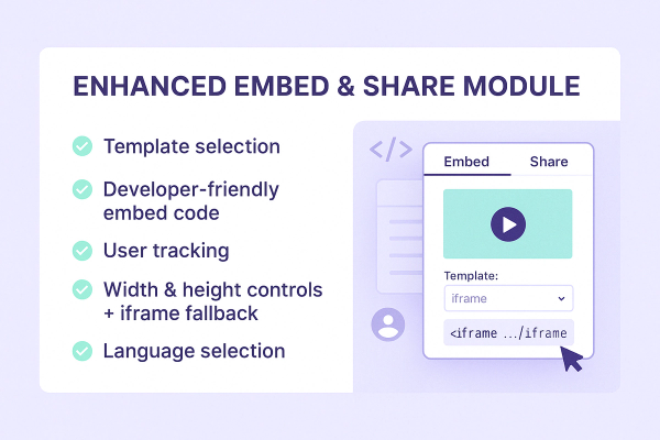 We’ve launched a major upgrade to the Embed & Share module, packed with new capabilities to give you more flexibility, customization, and control over how your media is shared and embedded. What’s new? ✅ Template selection – Apply a visual template to your media; it’s automatically included in the embed code and share URL ✅ Developer-friendly embed code – Cleaner, more flexible code for advanced customization and integration ✅ User tracking – Capture viewer identity for deeper engagement insights ✅ Width & Height controls + iframe fallback – Easily adjust dimensions and ensure compatibility across platforms ✅ Language selection – Set the language for the embed code or share URL to localize the experience ✅ Popup embed support – Use a new embed code that displays a thumbnail or text link on your page and opens the video or gallery in a fullscreen popup on click How to use it: Go to your Media Library , click on any asset, and open the Embed or Share Media tab to access these new options.